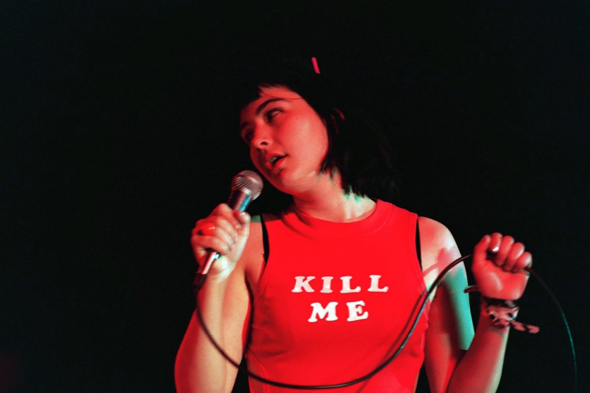 Na época de seu lançamento, Mariana Ferrer não havia sido humilhada pelo advogado que defendia seu estuprador. Mas, ainda assim, essa cena acionou em mim outros códigos externos a narrativa. Logo em meu primeiro contato com a obra, essa abertura me remeteu a uma imagem de Kathleen Hanna, vocalista da banda punk Bikini Kill, em um show beneficente pela causa do aborto seguro em 1993. No registro, que se tornou um ícone da cultura pop, Hanna veste um vestido vermelho, feito por ela mesma, com os dizeres: KILL ME (ME MATE). Ainda adolescente, quando consumia bastante música rock dos anos 1990, essa imagem me marcou de maneiras muito similares a abertura de Mate-me por favor. Em entrevista cedida para o portal The Cut em 2013, Hanna explica que sua ideia para o vestido partiu da reflexão sobre o que exatamente constitui “estar pedindo por um assédio”. “Se você usar um vestido que diz ‘me mate’ você está pedindo por isso?”, questiona ela.33 A abertura do filme de Silveira ecoa essa mesma reflexão. Uma garota triste, solitária, bêbada, com roupas curtas que anda sozinha em uma rua escura e perigosa, está pedindo para ser violentada? Para além do alinhamento discursivo, o filme constrói uma imagem igualmente potente. Enquanto Hanna fez um show usando um vestido que em letras grandes e brancas nos diz ME MATE e essa imagem segue eternizada em fotografias até a atualidade, o filme coloca as palavras MATE-ME POR FAVOR, também em letras grandes e brancas, logo após o plano do rosto de uma mulher gritando em desespero e enquanto ainda podemos ouvir seus gritos. Além de ser o título do filme, a frase, dentro dessa decupagem, reveste-se do sentido alegórico de representar o “pedido” da mulher que grita antes de ser assassinada.