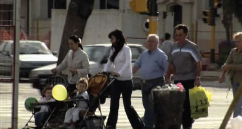 Sin embargo, Ramiro quiere volver de los Estados Unidos. Arturo y Leandro, luego del choque entre ambos, terminan “juntos” en la cocina de la casa. Si el espacio privado es incómodo, el espacio público tampoco es receptivo: siempre está sobrecargado de gente, coches, voces, mercancías, bocinas. En el espacio público los personajes se encuentran tan ajenos a aquello que los cerca que todo a su alrededor termina fuera de foco. La turbiedad provocada crea una nebulosa que envuelve a las figuras en primer plano y hace que la ciudad, aunque no aparezca con nitidez, opere continuamente sobre los personajes, rodeándolos y presionándolos (Figura 4).