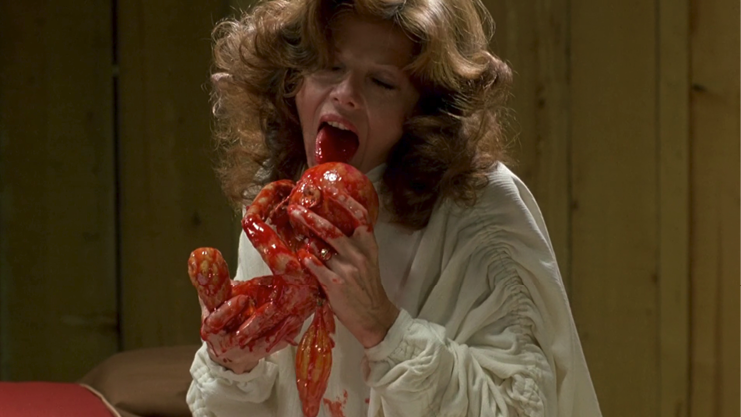 En México, The Brood se tradujo como El engendro del diablo, un título significativo desde varios aspectos. Por un lado, promueve la idea de que el ser que gesta a los niños asesinos es diabólico, pero en el transcurrir de la película también identifica esa idea con la madre, Nola, poseedora de un saco uterino artificial en cuya interior crece y se reproduce el mal. Históricamente, el papel asignado a las mujeres respecto a la maternidad ha estado relacionado con el útero. Mona Chollet menciona cómo desde la entrada de la palabra “Mujeres” en la Enciclopedia de Diderot y D’Alambert se remarca que el destino femenino es tener hijos y alimentarlos, dado que la tarea de la mujer es ser madre. Destino en el cual desempeña un rol fundamental el útero, también descrito en ocasiones como “un animal temible”, poseído “por el deseo de producir hijos”10. Del mismo modo, se da por sentado que el acto de engendrar simboliza la virtud de lograr la plenitud de las necesidades tanto emocionales como eróticas de las mujeres, y a su vez de regularlas. La maternidad como deber constituye un mandato de enorme impacto social que se ha mantenido vigente por largo tiempo. En el caso de este film, la secuencia de engendrar, parir y maternar aparece ligada a un resultado aterrador, que discurre de las ideas romantizadas y extendidas en el colectivo social sobre la descendencia humana. Los hijos de Nola están dotados de una apariencia espeluznante, y cuando ella se desestabiliza, reaccionan de manera agresiva, como si estuviesen unidos por un cordón umbilical invisible, como ejecutores de sus propios sentimientos de ira.