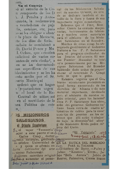 Figura 3. Artículo titulado: “Los misioneros Salesianos del Oriente Ecuatoriano”. (5 de mayo de 1923). Periódico La Alianza Obrera (Cuenca- Ecuador). Fuente: Cinemateca nacional del Ecuador.
