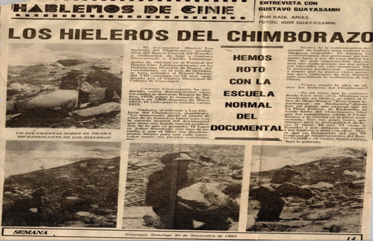 -Cine Nacional Socialista (1980-2000): Existe una evolución en cuanto al proceso cinematográfico (la puesta en escena, uso de más de una cámara, escenas panorámicas de paisajes, aparece el travelling, el montaje también se presenta más elaborado y pensado en función del lenguaje cinematográfico, se usa el color, se usa trípode con trabajados movimientos de cámara, hay una preocupación por la prolijidad del sonido; etcétera) también aparecen nuevas modalidades de representación como el documental observacional, o la modalidad interactiva16. A partir de este período hubo un boom en cuanto a la aparición de nuevas y nuevos realizadores, incluyendo, aunque de forma reducida, a cineastas indígenas como Alberto Muenala, Segundo Fueres o Eriberto Gualinga. En este período destaca la película Los hieleros del Chimborazo, obteniendo reconocimiento de su círculo de pares y abriendo el camino a los nuevos cineastas ecuatorianos en espacios internacionales (Figura 4).