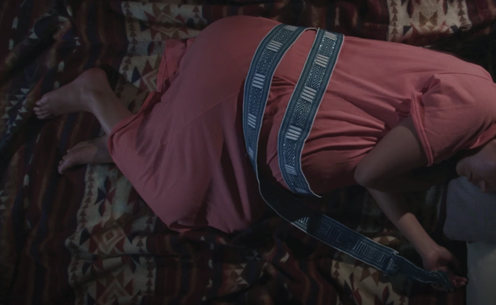El uso de los recursos del falso documental no se limita a la actuación: el embarazo falso, la prueba de embarazo falsa, la consulta médica falsa, o el vientre falso de embarazada que usa Citlalli, ponen en evidencia que hay una puesta en escena muy elaborada donde existe una simbiosis entre la ficción y la no ficción, incluso se hace el uso de la técnica de stop-motion para animar una escena donde se ve a Citlalli en un plano cenital acostada en la cama mientras una faja tradicional, que usan las mujeres de su comunidad, rodea su barriga (Figura 6). La música estuvo a cargo de la banda Trencito de los Andes y también fue un proceso largo que tardó aproximadamente un año en concretarse; Huahua es una película que nos demuestra un trabajo extenso, donde existe una preocupación meticulosa por todos los detalles, incluso los créditos de la película son intervenidos con fotografías de todo el equipo cuando eran huahuas. Esta apropiación de varias técnicas cinematográficas propias de la ficción (planos de cámara, montaje, puesta en escena, actuación) en su hibridez con las técnicas del cine documental (entrevistas, cámara observacional, archivo familiar) permiten representar y problematizar la realidad de las comunidades indígenas de una manera innovadora en el campo del documental contemporáneo, dejando de lado la mirada etnocentrista y antropológica que ha prevalecido en la cinematografía ecuatoriana, rompiendo con el paradigma establecido y con la imagen cliché de la población indígena, planteando una nueva forma de mirar y mirarse, siendo un aporte excepcional para la creación de nuevas maneras de contar historias, nuevas imágenes y nuevas subjetividades dentro del imaginario sobre lo indígena.