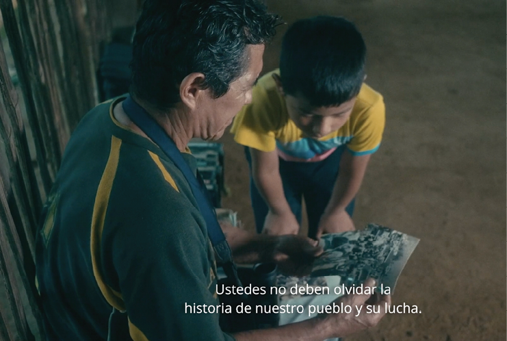 Las entrevistas de la película (que se alternan con imágenes de la cotidianidad, animaciones y material de archivo) son una herramienta usada para dar más valor a los temas expuestos, las voces autorizadas de líderes o lideresas de las distintas comunidades le otorgan un valor adicional al discurso presentado, esa también es una característica novedosa ya que los personajes aparecen como autoridades y como las personas más importantes de la historia, dejando de lado la noción de subordinación o dependencia con respecto al poblador blanco-mestizo que predominó en el cine realizado a lo largo del siglo pasado. En un rasgo que evoca a la tradición oral de los pueblos indígenas (para quienes el traspaso de conocimiento a través de contar historias es un hecho habitual), se crea un relato cinematográfico donde las imágenes del pasado son mostradas por los adultos a los más pequeños mientras les hablan del presente, reivindicando una de las tradiciones más importantes de los pueblos indígenas a través del archivo audiovisual que culmina con la movilización nacional de Octubre de 2019 (Figura 7), donde aparecen nuevas imágenes de los pobladores indígenas que se contraponen a las imágenes de la movilización de 1990 y se erigen como la actualización de un archivo audiovisual que está en perpetuo crecimiento.