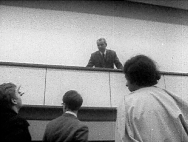 Esta forma de tratar las imágenes es una de las principales estrategias con las que la película organiza su archivo, aunque no siempre será resuelta de la misma manera. Más adelante y sobre los registros del mayo francés, la película repite un procedimiento similar. Se trata del momento en que se presenta la figura de Daniel Cohn-Bendit, secuencia que comienza con un fragmento del documental Esto es apenas el inicio3, realizado durante las protestas por un colectivo de estudiantes y profesores de la Sorbonne. En él aparece un grupo de estudiantes discutiendo con las autoridades de la universidad. Durante la discusión, uno de ellos levanta un dedo y en ese momento En el intenso ahora detiene la imagen, interrumpiendo el fragmento original del documental. El fotograma que queda congelado divide el plano en dos: las autoridades arriba, de frente a cámara, y los estudiantes abajo, de espaldas. Sobre esta imagen, la voz del narrador pone en contexto lo que acabamos de ver; menciona el título del documental, el momento de filmación y la decisión de los cineastas de no incluir el nombre de los estudiantes que aparecían en él. Sin embargo, el narrador sí lo hace, señala al estudiante del dedo levantado (congelado ahora en un costado de la imagen) y le pone nombre: dice que es Cohn-Bendit y agrega que, a pesar de que “todos conocían su nombre (...) la idea de un movimiento sin líderes era bonita”4.