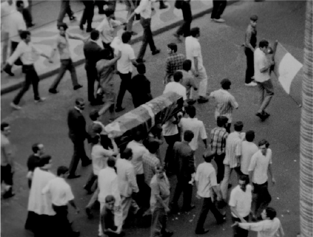 Según estas palabras, el sufrimiento se ubica dentro del ámbito privado. Por esa razón está presente en Praga, pero no en Río de Janeiro. Palach es un muerto al que llora su familia, como lo demuestran las imágenes registradas e incluso a pesar de la presencia masiva del pueblo, que no parece estar ahí de la misma manera que lo está en Brasil. El de Praga es un pueblo que ya no puede luchar, así lo refleja el testimonio de la médica que atendió a Palach, el cual aparece también incluido en esta secuencia. En cambio, el funeral de Edson Luis de Lima Souto es una manifestación, una procesión multitudinaria donde la misma gente es la que traslada su ataúd por las calles hasta el cementerio. En estas imágenes, para el narrador no es posible detectar quién realmente sufre porque no es posible detectar quién realmente lo conocía, nadie menciona a su familia: “(...) En los veintitrés minutos de material capturado por varias cámaras, apenas dieciocho segundos muestran a alguien que sufre (...) Edson Luis es enterrado con más indignación que dolor”22.