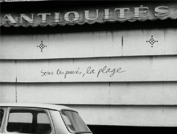 Hacia el final, la película vuelve a esta idea; el montaje reúne una serie fotografías de grafitis, carteles y pintadas hechas durante las protestas estudiantiles hasta detenerse en una de ellas, una pared escrita donde se lee: “debajo de los adoquines, la playa”. Nuevamente, el narrador aparece para reponer información sobre lo que estamos viendo. Dice que fue una de las frases que mejor supo resumir las promesas del mayo francés y explica: “después de la lucha, no sólo vendría justicia sino también el mar, el placer, las vacaciones, las fiestas, la alegría”6. Cuenta que existen dos versiones sobre el origen de esta frase. La primera es la que aparece en los libros “que celebran este período histórico”7. Según esta versión, la frase fue creada cuando un estudiante, en medio de una protesta, levantó un adoquín y vio arena debajo de las calles, lo que lo llevó a exclamar lo que se convertiría en uno de los principales estandartes del movimiento. Sobre la segunda, que se desarrolla inmediatamente después, el narrador dice lo siguiente: “(...) ese estudiante no era un estudiante, era el dueño de una agencia publicitaria. La frase no surgió de la mente de uno de los estudiantes inspirado por la revolución, fue el fruto del trabajo penoso de dos publicitarios buscando un slogan que pueda movilizar a sus compañeros”8. Y agrega, además, que este episodio no sucedió en la calle sino dentro de un bar, durante un brainstorming entre publicistas.